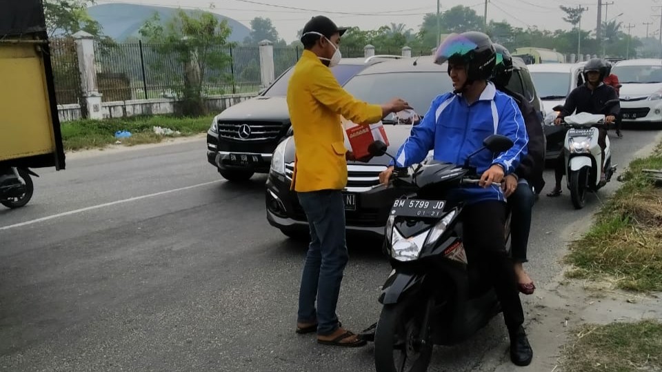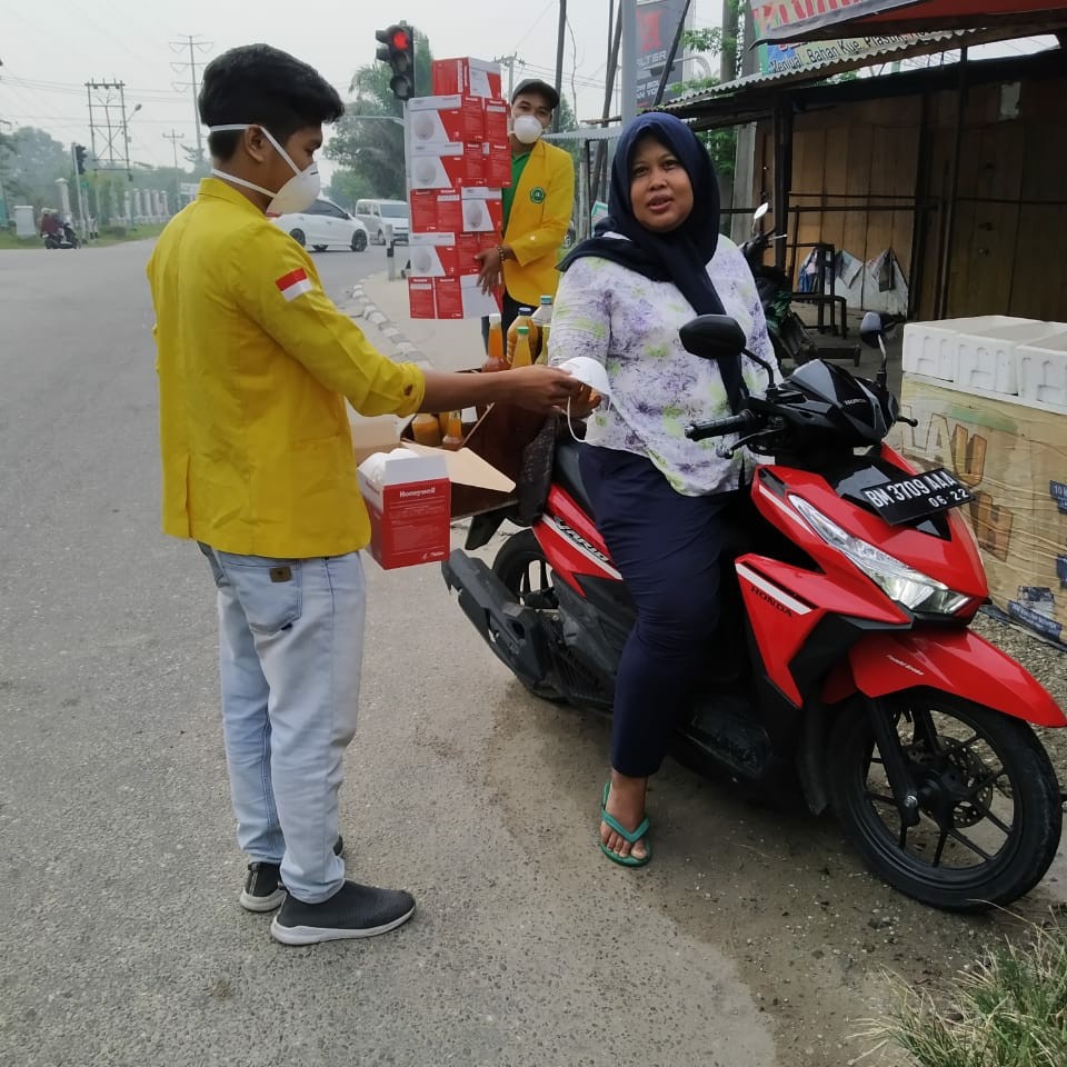 "Hari ini, Selasa (6/8/2019) kita bekerjasama dengan BEM Unilak dan pihak kepolisian membagikan 5000 masker kepada pengendara kenderaan bermotor dan masyarakat di simpang lampu merah Rumbai," Kata Alfian