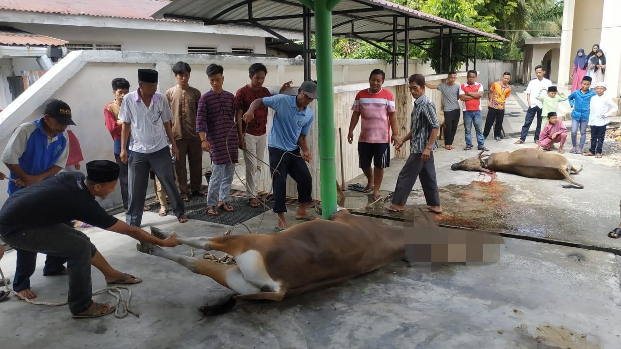 Pantauan ranahriau.com, di Masjid Al'mubaraq, Minggu (11/8/19) sekitar pukul 10.00 WIB dan para petugas sudah bersiap-siap menyembelih 3 ekor Sapi dan 3 ekor Kambing dari warga. Sejumlah petugas seragam bebas rapi dan membawa peralatan penyembelihan, seperti parang, pisau dan lain-lainnya.