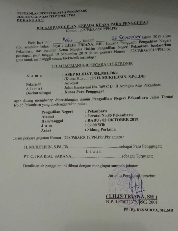 TELUK KUANTAN, RANAHRIAU.COM - Gugatan yang diajukan oleh KUD Langgeng ke Pengadilan Negeri Pekanbaru yang sedianya akan dilaksanakan sidang perdana pada hari Rabu tanggal 2 Oktober 2019 akhirnya batal dilaksanakan. Batalnya sidang tersebut disebabkan karena PT. Citra Riau Sarana selaku pihak tergugat tidak hadir alias mangkir dari jadwal sidang yang sedianya akan dilaksanakan pukul 09:00 WIB di Kantor Pengadilan Negeri Pekanbaru.