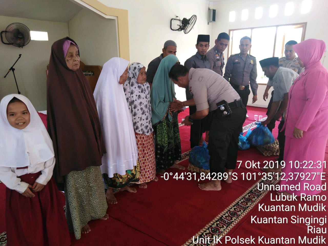 Pendistribusian bantuan kemanusiaan tersebut berlangsung di Mesjid Ummu Shafiyyah Desa Lubuk Ramo Kecamatan Kuantan Mudik, Kabupaten Kuantan Singingi, yang diserahkan langsung oleh Kapolsek AKP. Afrizal, SH, M.Si. Senin (7/10/2019) pagi tadi.