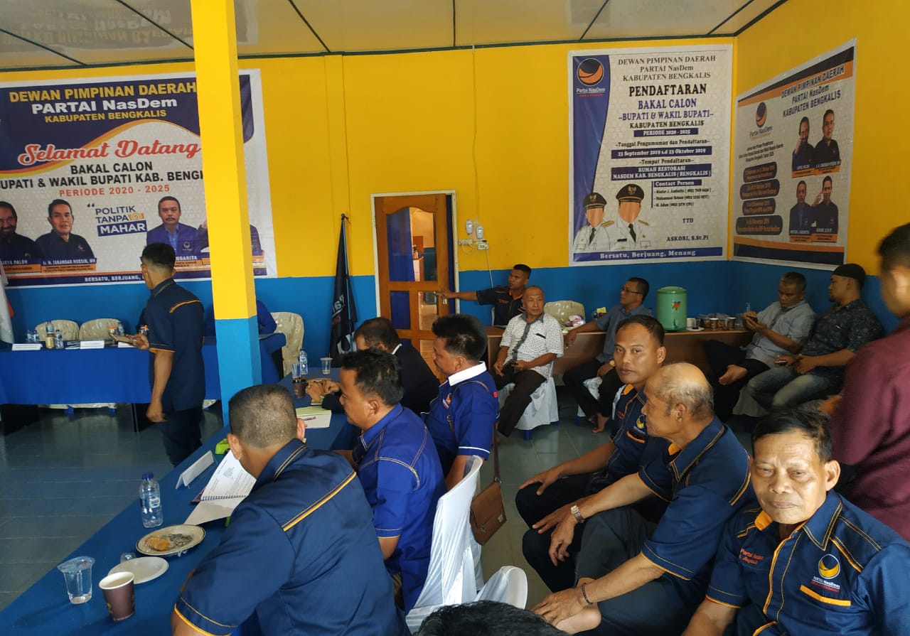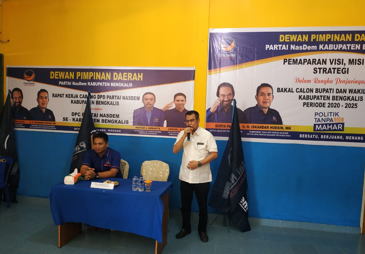 BENGKALIS, RANAHRIAU.COM - Dewan Pimpinan Daerah (DPD) Partai Nasional Demokrat (Nasdem) Kabupaten Bengkalis, melakukan pemaparan penyampaian visi misi bakal calon Bupati (Cabup) dan Calon Wakil Bupati (Cawabup) Kabupaten Bengkalis periode 2020-2025, di Jalan Bantan, dusun III, Desa Senggoro, Kecamatan Bengkalis, Kabupaten Bengkalis." Senin (28/10/19).