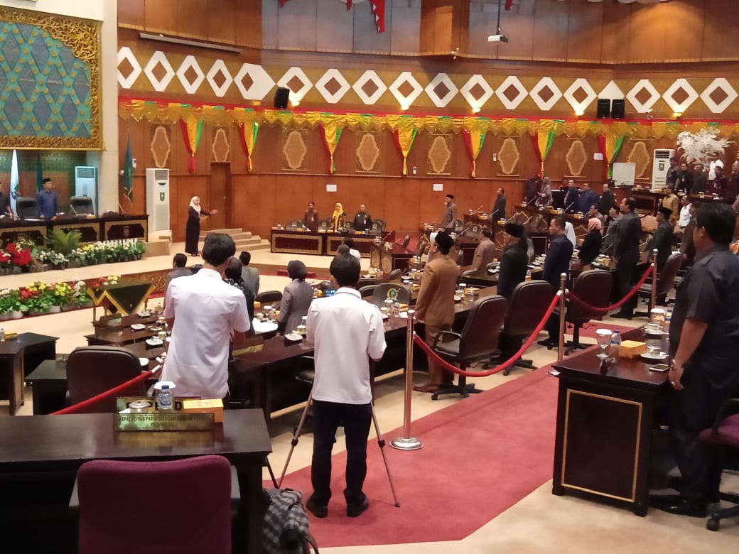 PEKANBARU, RANAHRIAU.COM - Rancangan Peraturan Daerah (Ranperda) Anggaran Pendapatan dan Belanja Daerah (APBD) Riau tahun 2020 disahkan pada Rabu (27/11/2019) malam pukul 23.25 WIB. Pengesahan Perda APBD Riau tahun 2020 sendiri tidak dihadiri Gubernur Riau Syamsuar, hanya dihadiri Wakil Gubernur H.Edi Afrizal Natar Nasution serta Sekdaprov H.Yan Pranajaya unsur Forum Komunikasi Daerah (Forkompinda) dan dihadiri 43 anggota dewan dari keseluruhan 65 orang.