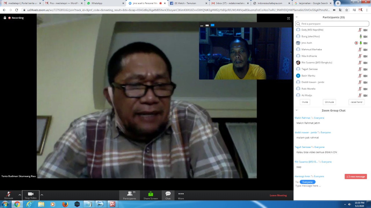 RANAHRIAU.COM - Rapat Koordinasi dan Evaluasi (Rakorev) Jaringan Media Siber Indonesia (JMSI) terlaksana dengan baik, Sabtu (02/05/2020). Rakorev yang dilaksanakan secara virtual ini diikuti 20 Pengurus JMSI Provinsi se Indonesia dari 26 pengurus yang ada dan dibuka langsung oleh Plt. Ketua Umum (Ketum) JMSI, Mahmud Marhaba.