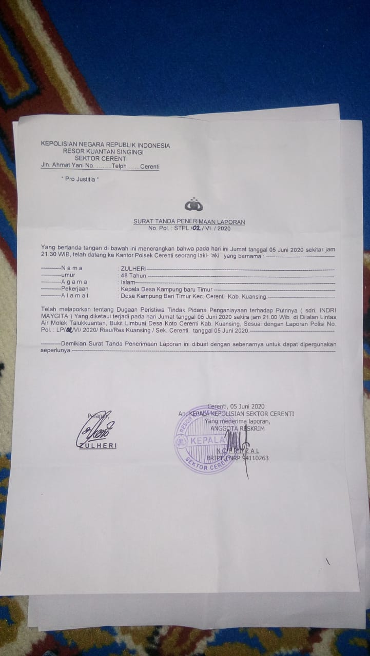 Atas hal itu, Zulheri (orang tua korban) Melaporkan ke pihak kepolisian dengan no Pol STPL : 02/VI/ 2020 /Resort KUANTAN SINGINGI / Polsek Cerenti, dengan dugaan penganiayaan.