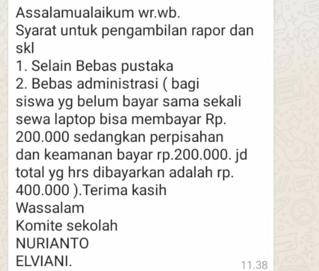 Pasalnya, pihak Sekolah SMPN 7 Mandau menyampaikan pengumuman kelulusan para muridnya melalui pesan Whats App dengan menuliskan adanya pungutan biaya.