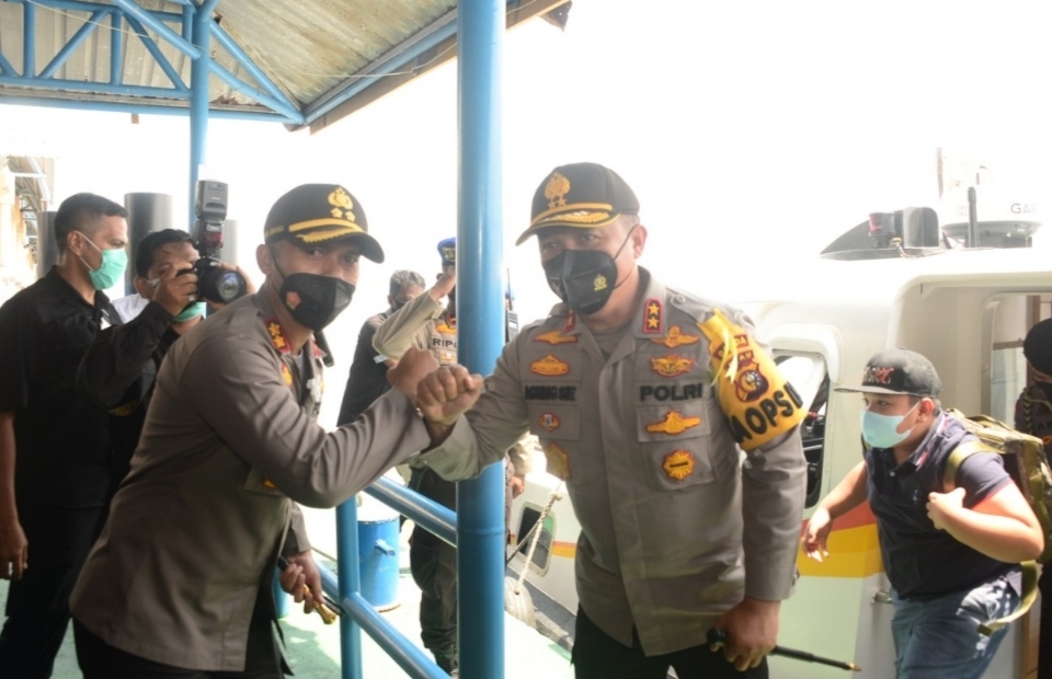 BENGKALIS, RANAHRIAU.COM - Kedatangan Kepala Kepolisian Daerah (Kapolda) Riau, Irjen Pol Agung Setya Imam Effendi sempena kunjungan kerjanya di Negeri Junjungan Kabupaten Bengkalis disambut langsung oleh Kapolres Bengkalis di dampingi Asisten Perekonomian dan Pembangunan Sekretariat Daerah Bengkalis, H Heri Indra Putra di Pelabuhan Bandara Sri Laksamana (BSL) Bengkalis, Rabu (20/10/2020) siang.