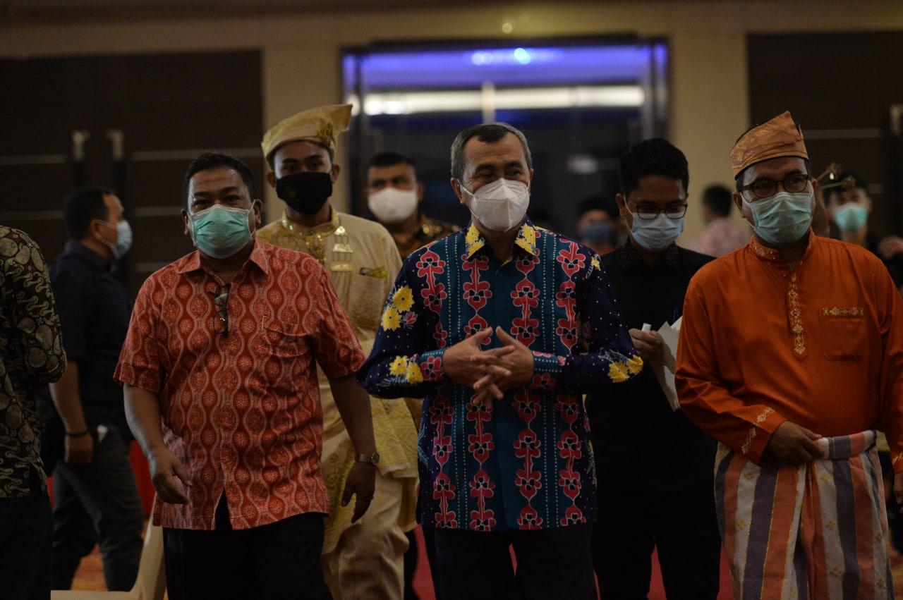 2. Gubernur Riau Drs H Syamsuar MSi didampingi Kadiskominfotik Riau Chairul Riski dan Komisioner KI Riau Jhony S Mundung memasuki ruang acara.