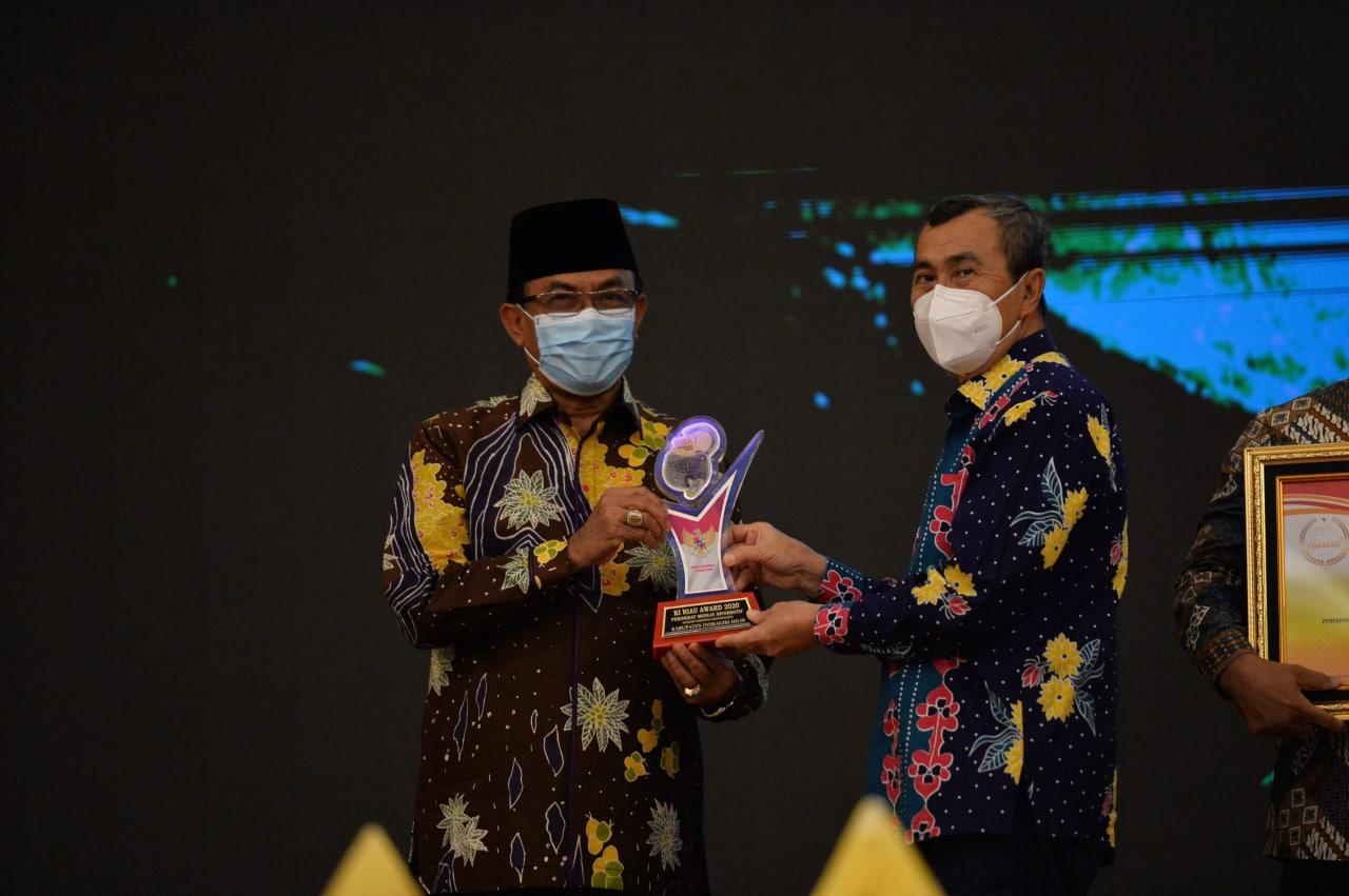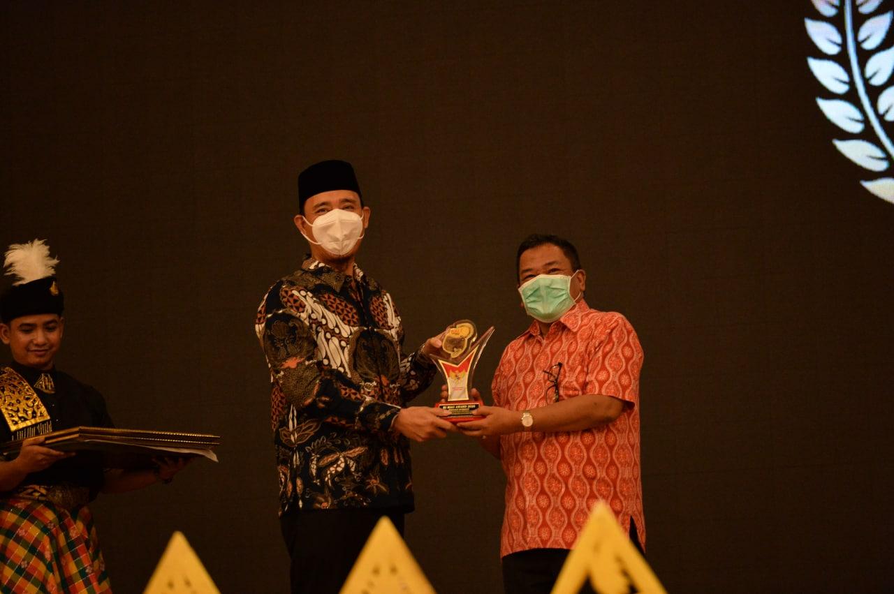 11. Gubernur Riau Syamsuar menyerahkan piala penghargaan kategori Kabupaten/Kota kepada PJ. Bupati Bengkalis, Syahrial Abdi.