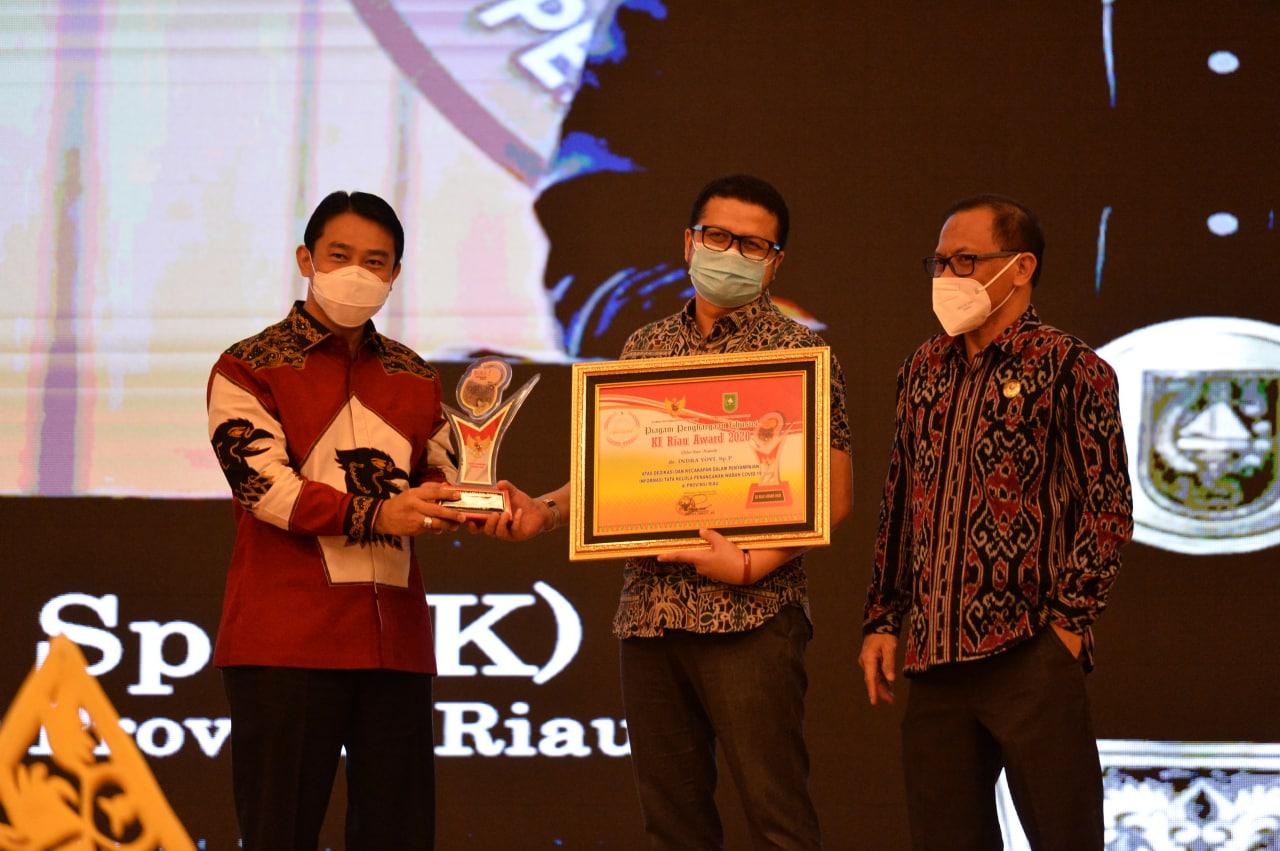 10. Pimpinan DPRD Riau Hardianto bersama Ketua Komisi Informasi Pusat Gede Narayana menyerahkan penghargaan khusus untuk Jubir Covid-19 Riau dr Indra Yovi