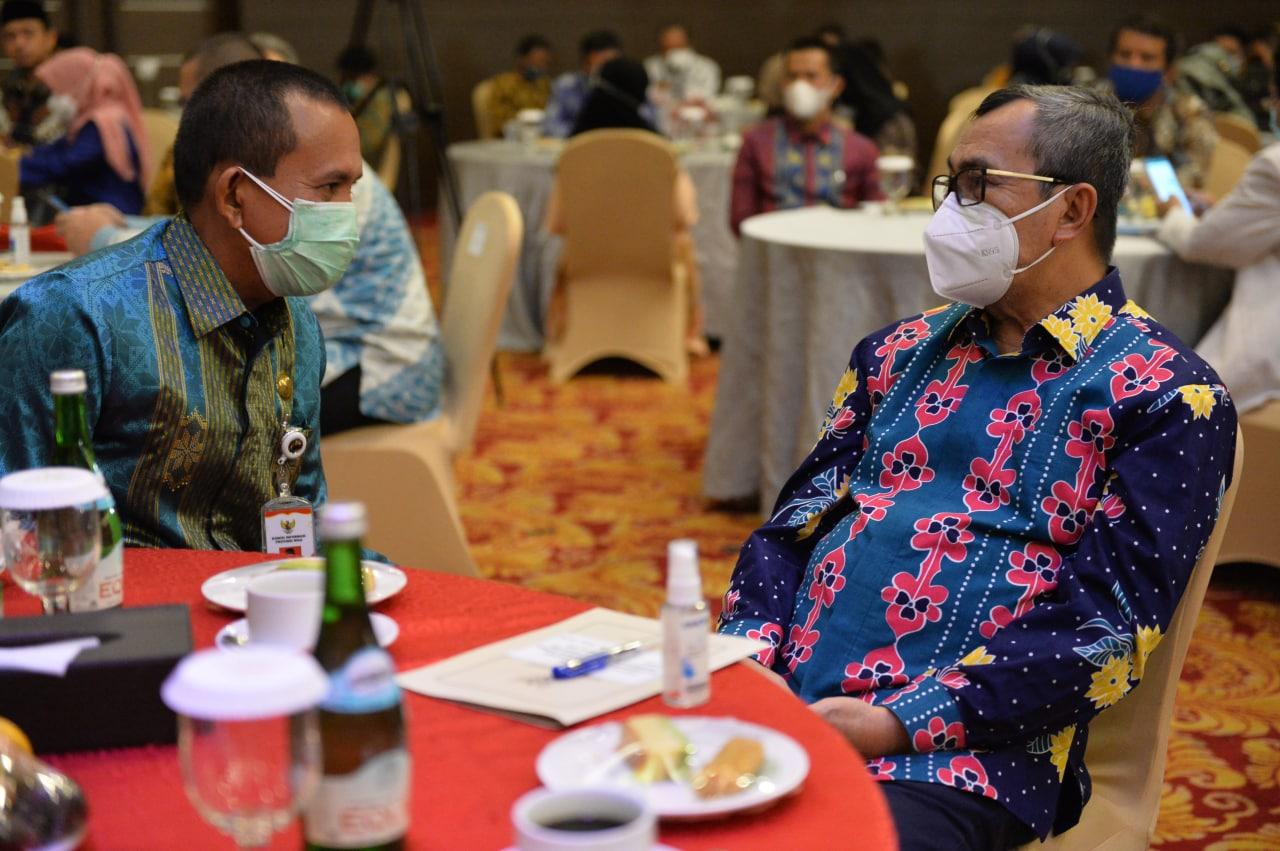 6. Ketua KI Riau Zufra Irwan berbicara serius dengan Gubernur Riau Syamsuar di sela-sela acara.