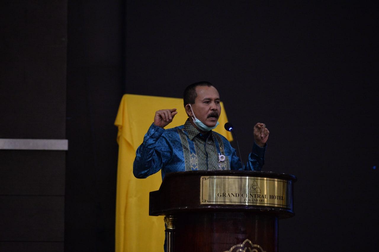 3. Ketua Komisi Informasi Riau Zufra Irwan,SE memberikan sambutan pada malam Anugerah Keterbukaan Informasi.
