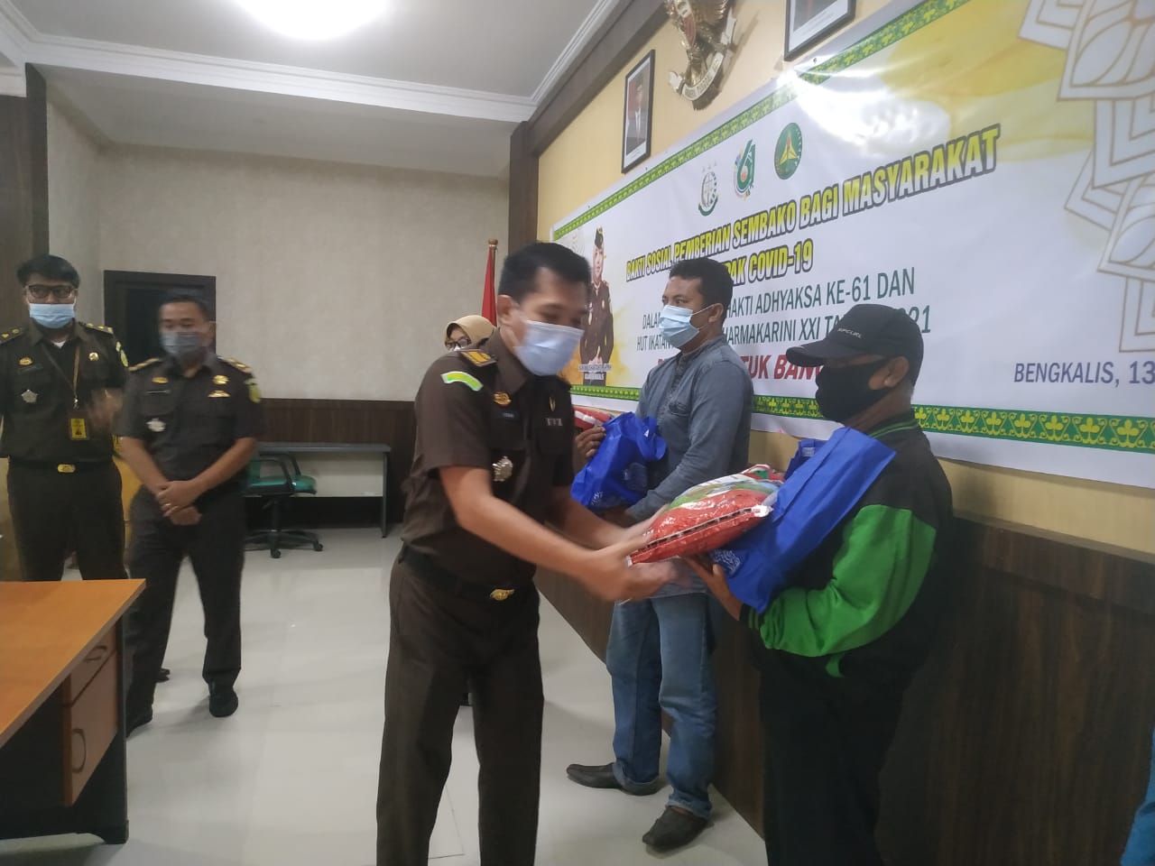 Paket sembako diserahkan oleh Kajari Bengkalis Nanik Kushartanti secara simbolis kepada perwakilan masyarakat seperti, tukang ojek dan tukang Becak. Sebelumnya, Kajari dan jajaran pejabat kasi Kejaksaan serta bersama perwakilan anggota IAD mengikuti acara secara virtual dengan Kejaksaan Agung RI.