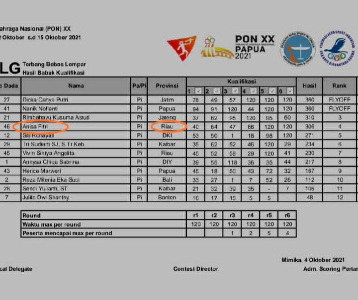 PEKANBARU, RANAHRIAU.COM - Salam olahraga, Federasi Aero Sport Indonesia (FASI), Persatuan Olahraga Dirgantara (Pordirga) Aeromodelling Provinsi Riau, dari kategori Discus Launch Glider (DLG) kelas Putri yang di isi atlet asal Kota Duri, Kecamatan Mandau, Kabupaten Bengkalis, dengan maksimal membukukan kemampuan catatan perolehan poin posisi rangking ke 4 (empat) pada helat bergengsi Pekan Olahraga Nasional (PON) XX Papua tahun 2021.