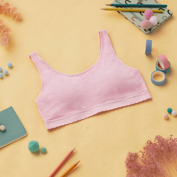 Girls AIRism Bra. Bentuk cup yang dapat diregangkan di 5 titik memastikan bra ini sangat nyaman dipakai oleh anak perempuan di masa pubertas yang mulai merasakan perubahan bentuk tubuh dari anak-anak ke remaja.
