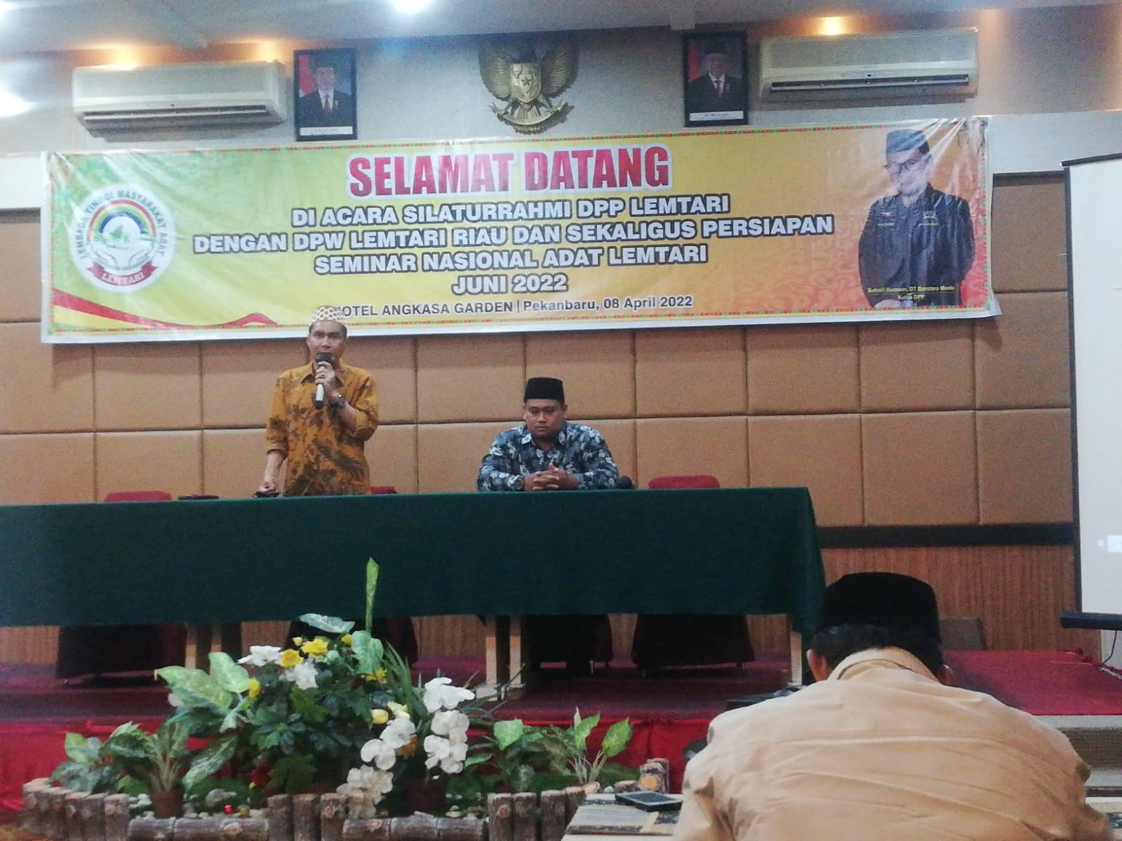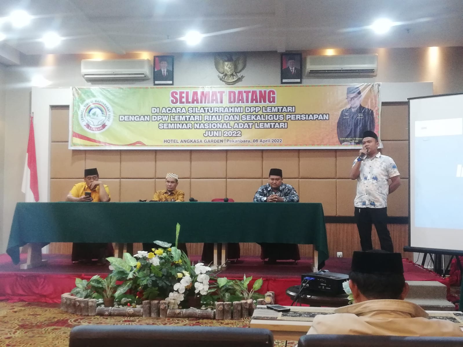 PEKANBARU, RANAHRIAU. COM- ACARA Silaturahmi DPP Lemtari dengan DPW Lemtari Riau dan sekaligus Persiapan Seminar Nasional Adat Lemtari yang diselenggarakan di aula Edelweis Hotel Angkasa Garden Pekanbaru, Jumat (08/04/2022).