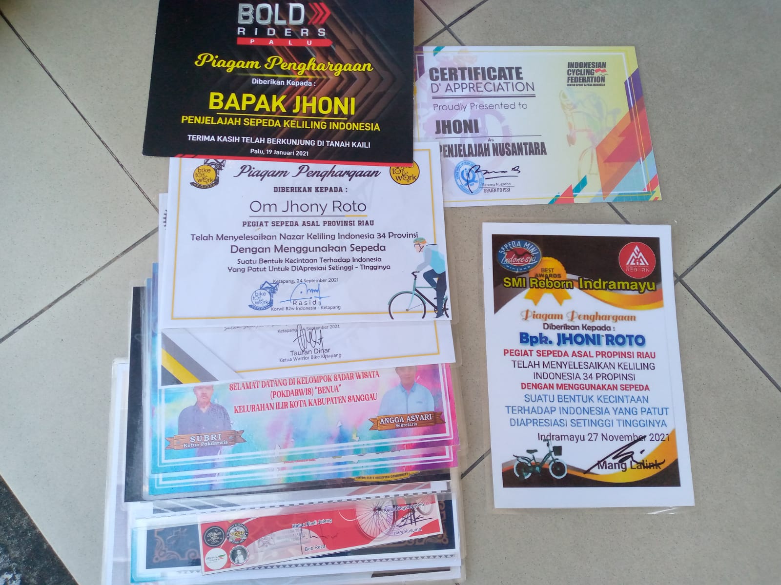 Foto : Sertifikat Penghargaan dan Piagam Yang diberikan Kepada Bapak Jhoni Roto