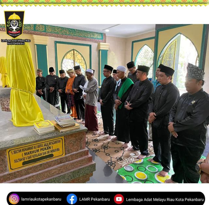 PEKANBARU, RANAHRIAU.COM- Ketua Umum DPA LAMR Kota Pekanbaru Datuk Seri Rizaldi Putra bersama pengurus LAMR Kota Pekanbaru dan perwakilan pengurus LAMR Kecamatan Se-Kota Pekanbaru melakukan ziarah ke Makam Sultan Muhammad Ali Abdul Jalil Mu’azamsyah (Marhum Pekan), melakukan ziarah di Makam Marhum Pekan (Pendiri Kota Pekanbaru) bertempat di Masjid Raya jalan Senapelan Kelurahan Kampung Bandar Senapelan Kota Pekanbaru, Jum'at (15/07/2022).
