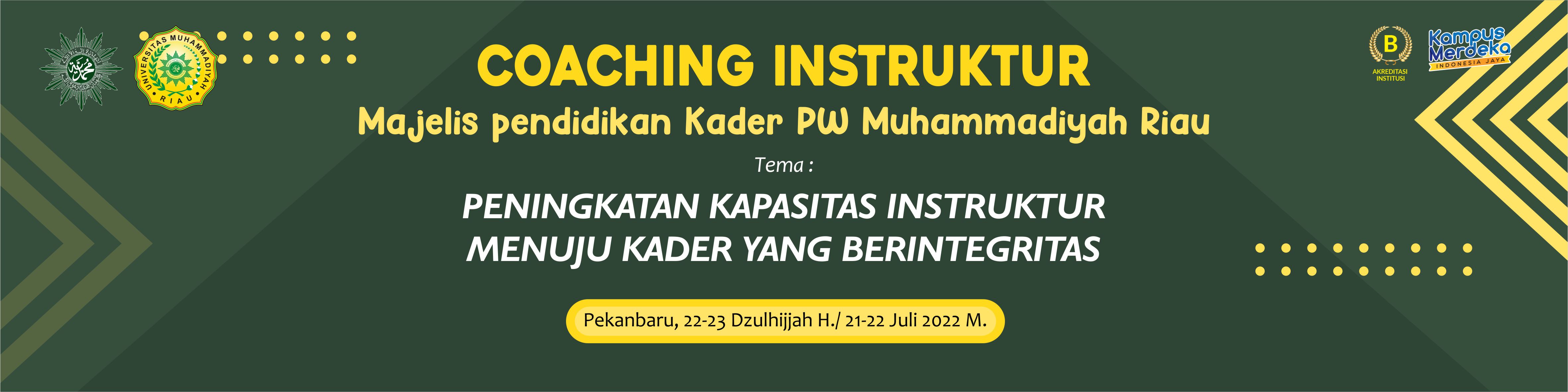 PEKANBARU, RANAHRIAU.COM-Dalam rangka meningkatkan Kapasitas Instruktur menuju Kader Berintegritas, Majelis Pendidikan Kader (MPK) Muhammadiyah Riau gelar coaching instruktur yang akan diselenggarakan di Wisma Jalur Pekanbaru, Kamis sampai Jumat (20-21/07/2022).