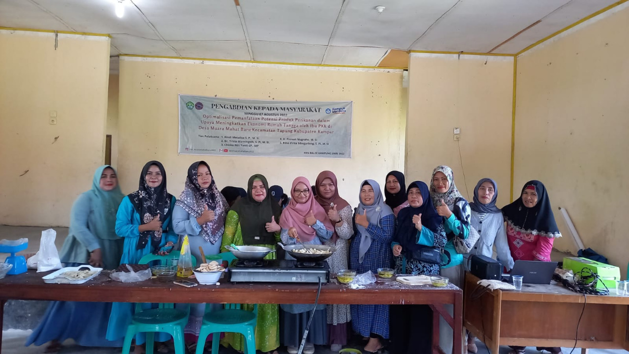 Kegiatan fasilitasi ibu-ibu PKK dalam pengolahan produk perikanan merupakan bagian dari kegiatan pengabdian kepada masyarakat yang dilakukan oleh Dosen Universitas Riau yaitu Rindi Metalisa, SP., M.Si selaku ketua tim pelaksana sekaligus Dosen Pembimbing Lapang Mahasiswa Kukerta UNRI, beserta anggota tim yaitu Dr. Trisla Warningsih, S.Pi., M.Si., Chicka Willy Yanti, SP., MP., Ir. Firman Nugroho., M.Si., dan Rina D’rita Sibagariang, S.Pi., M.Si. Kegiatan ini juga melibatkan Mahasiswa Kukerta Balek Kampung 2022 Desa Muara Mahat Baru yang diketuai oleh Farhan Ariqqulhuda.