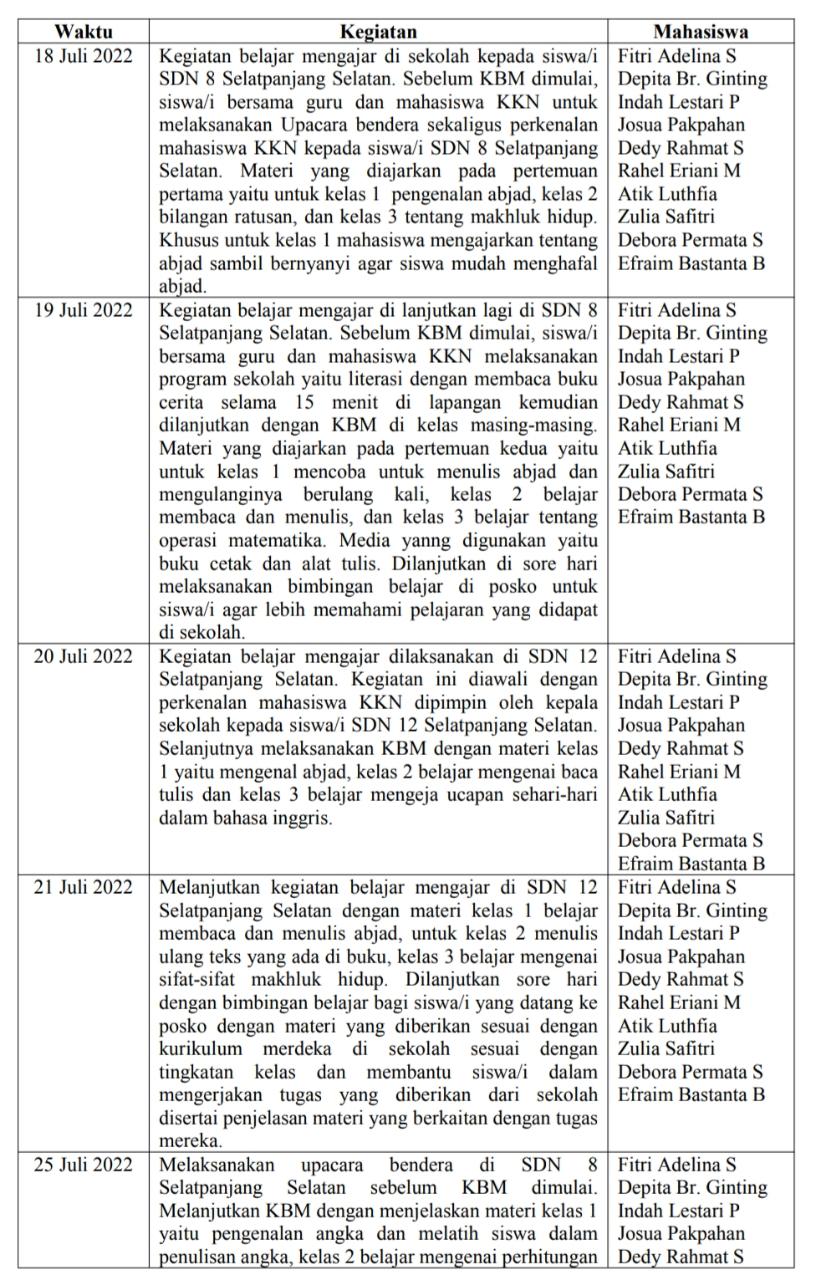 Dalam upaya pelaksanaan salah satu program kerja KKN yaitu kegiatan belajar mengajar di sekolah, mahasiswa KKN melakukan persiapan dengan melakukan survey ke sekolah dan bertemu kepala sekolah untuk meminta izin dalam pelaksanaannya. Pertemuan ini juga disertai dengan pembuatan jadwal mengajar mahasiswa KKN di sekolah. Pertemuan dengan pihak sekolah ini berjalan dengan lancar dan pihak sekolah juga menerima mahasiswa KKN dengan baik demi membantu untuk mencerdaskan anak-anak di Kelurahan Selatpanjang Selatan.