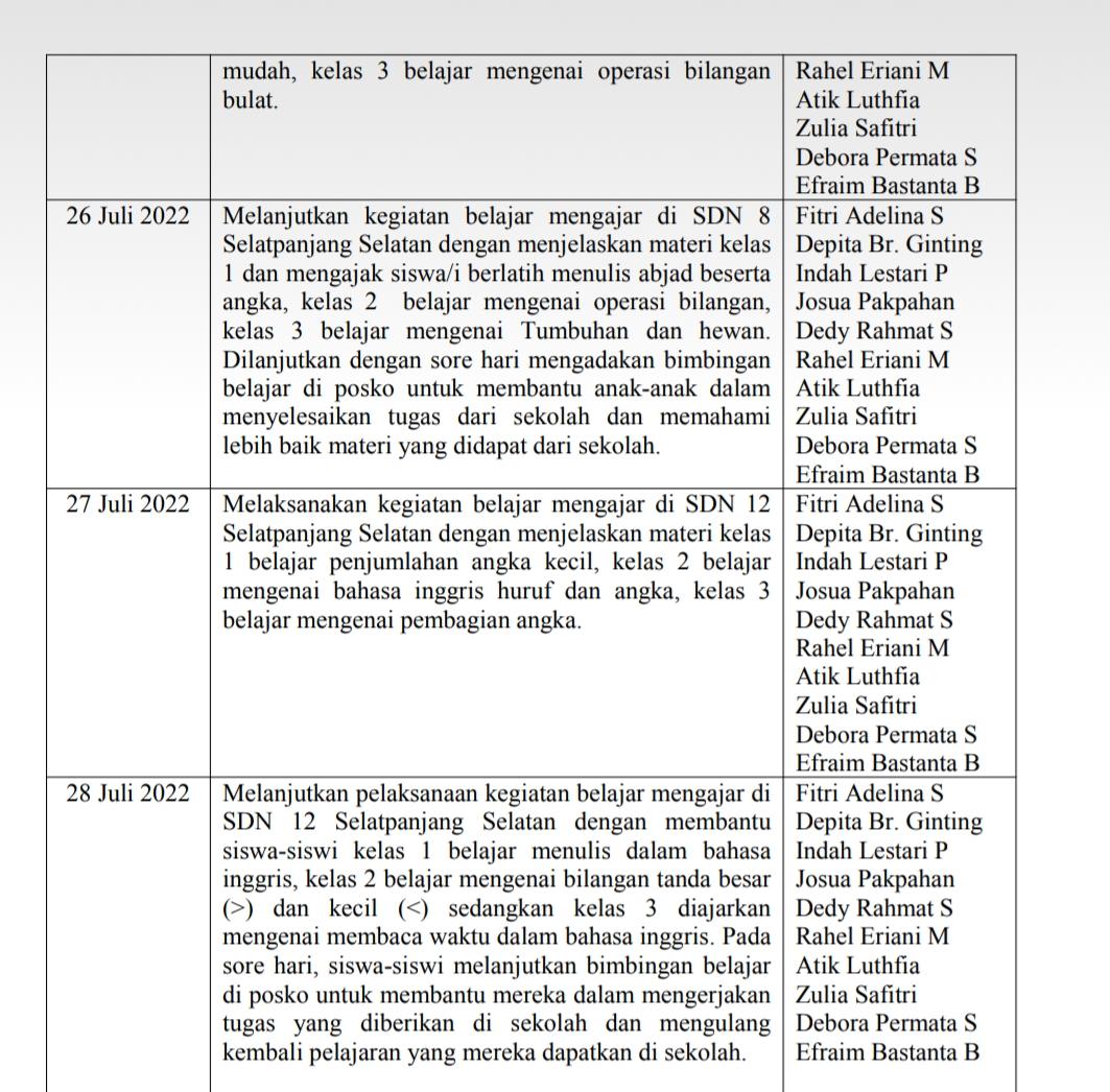 Kegiatan belajar mengajar dan bimbingan belajar di posko berfokus pada kelas 1 sampai 3 dalam pendalaman materi IPA, pengenalan abjad dan pengenalan angka. Materi yang diberikan mengikuti panduan buku cetak dari sekolah dan panduan dari buku online yang didapat dari google dengan mengikuti kurikulum merdeka. Mahasiswa juga membantu siswa/i dalam mengerjakan tugas yang diberikan dari sekolah. Kegiatan dilakukan selama dua minggu dimana dalam seminggu ada 4 kali pertemuan. Metode yang digunakan untuk kelas 3 yaitu diskusi dan tanya jawab yang bertujuan agar siswa antusias mengikuti pembelajaran. Sedangkan untuk kelas 1 materi yang diberikan pengenalan abjad dan angka karena banyak yang belum bisa membedakan huruf, pembelajaran lebih banyak bernyanyi dan bermain agar siswa tidak bosan, antusias, dan mudah mengingat.