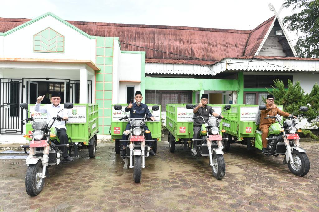 DUMAI, RANAHRIAU. COM-Direktur Utama Bank Riau Kepri (BRK) Syariah Andi Buchori bersama timnya menyalurkan program bantuan corporate social responsilbiltiy berupa 5 motor HTM pengangkut sampah dan dua unit BIN Sampah.