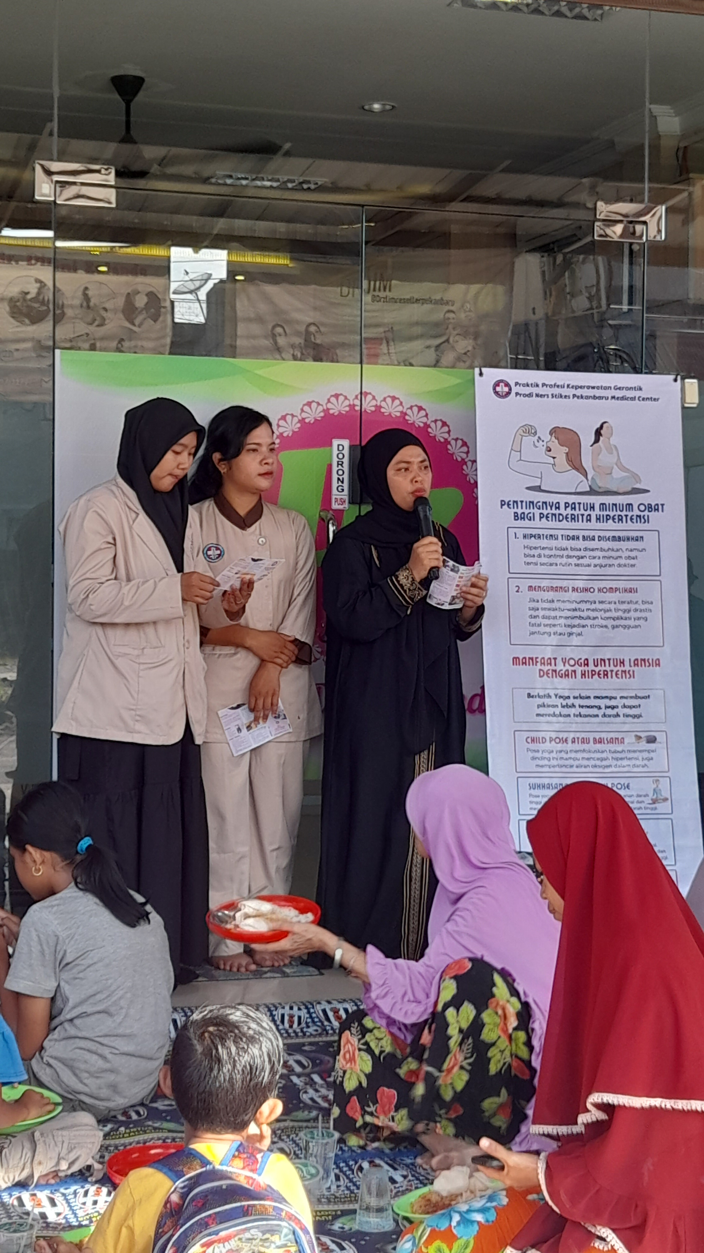Edukasi tentang pentingnya rutin minum obat bagi penderita hipertensi adalah upaya promotif dan preventif oleh tenaga kesehatan bagi masyarakat yang mempunyai riwayat hipertensi supaya tidak mengalami bahaya komplikasi yang disebabkan oleh penyakit yang biasa di sebut Silent Killer ini. Selain itu mahasiswa Ners Stikes PMC juga memberikan edukasi tentang latihan fisik atau exercise yang bisa membuat penderita hipertensi lebih merasa bugar dan tentunya bisa menurunkan tekanan darah. Latihan fisik yang cocok bagi penderita hipertensi salah satunya adalah yoga. Ada beberapa gerakan yoga yang di ajarkan oleh mahasiswa Ners Stikes PMC yaitu Child Pose atau Balsana, Sukhasana atau easy pose, Shavasana, Cobra Pose, Bridge Pose.