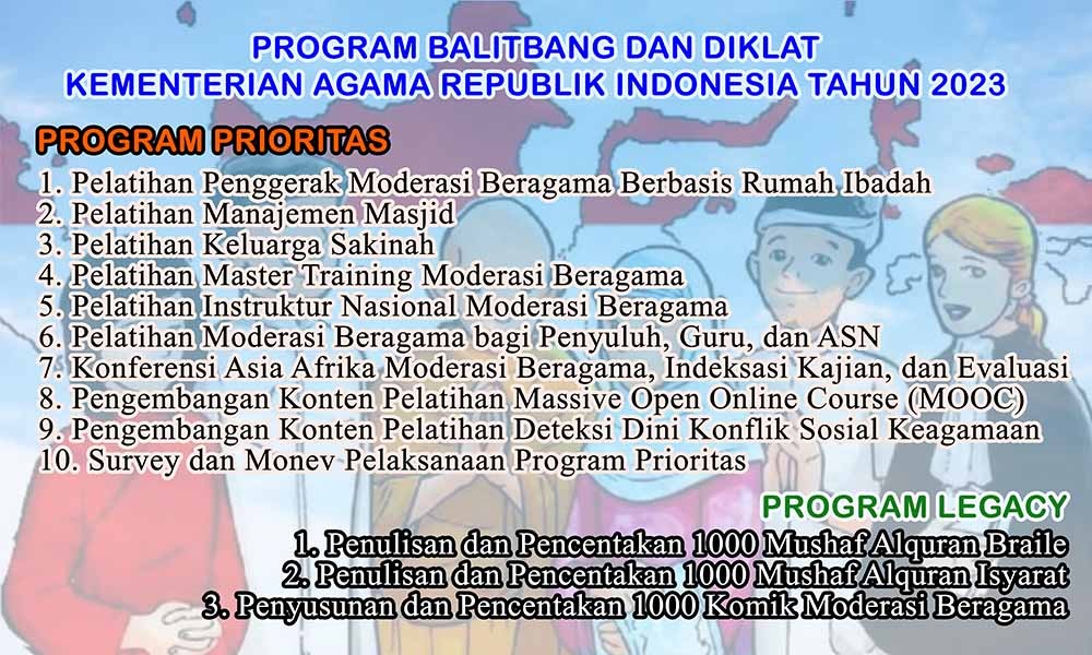 Pada tahun anggaran 2023 ini, Balitbang dan Diklat Kementerian Agama RI telah berhasil melaksanakan program legacy yang berwujud dalam bentuk karya agung Kemenag yang sangat berguna bagi perkembangan peradaban Indonesia ke masa depan, khususnya dalam hal pengembangan kehidupan beragama (Islam) dan moderasi beragama. Setidaknya ada tiga program legacy yang telah sukses dikejakan oleh Tim Kemenag, yakni penyelesaian penulisan dan pencentakan Mushaf Alquran Braile, penyelesaian penulisan dan pencentakan Mushaf Alquran Isyarat, serta penyusunan dan pencentakan Komik Moderasi Beragama.