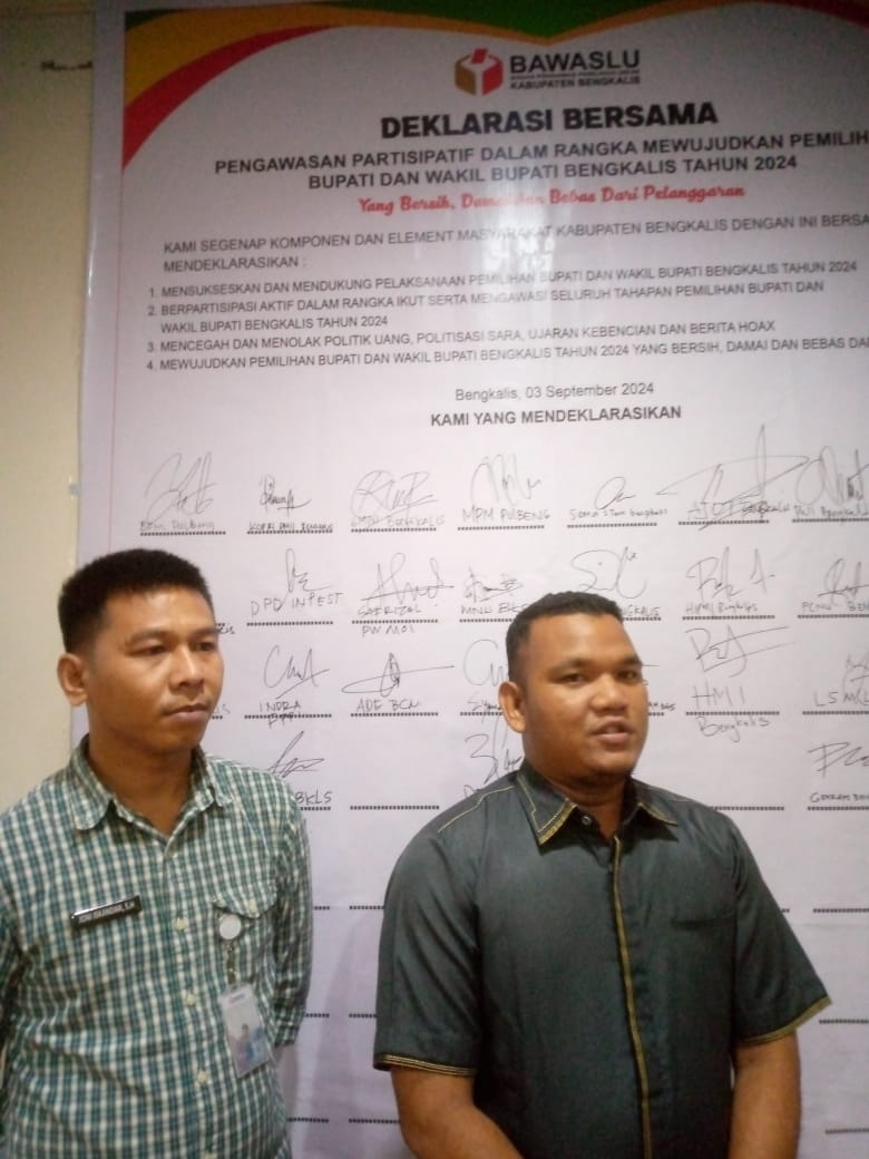 Selanjutnya, Bawaslu Bengkalis bersama peserta yang hadir melakukan penandatangan deklarasi bersama dalam mewujudkan pemilihan Bupati dan Wakil Bupati Bengkalis yang bersih, damai dan bebas pelanggaran.