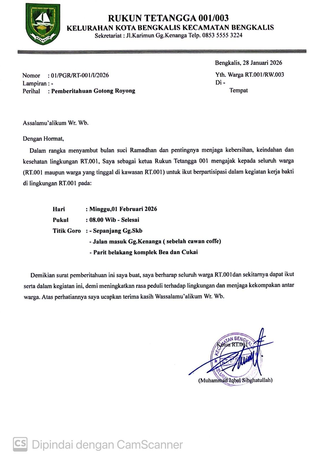 BENGKALIS, RANAHRIAU.COM - Dalam rangka mempererat tali silturahmi dan menjelang memasuki bulan Suci Ramadhan 1447 H/2026 M, warga RT 001/RW 003 Kelurahan Kota Bengkalis, Kecamatan Bengkalis akan menggelar gotong royong (Goro) dengan mengusung tajuk "Bersih Kampung".
