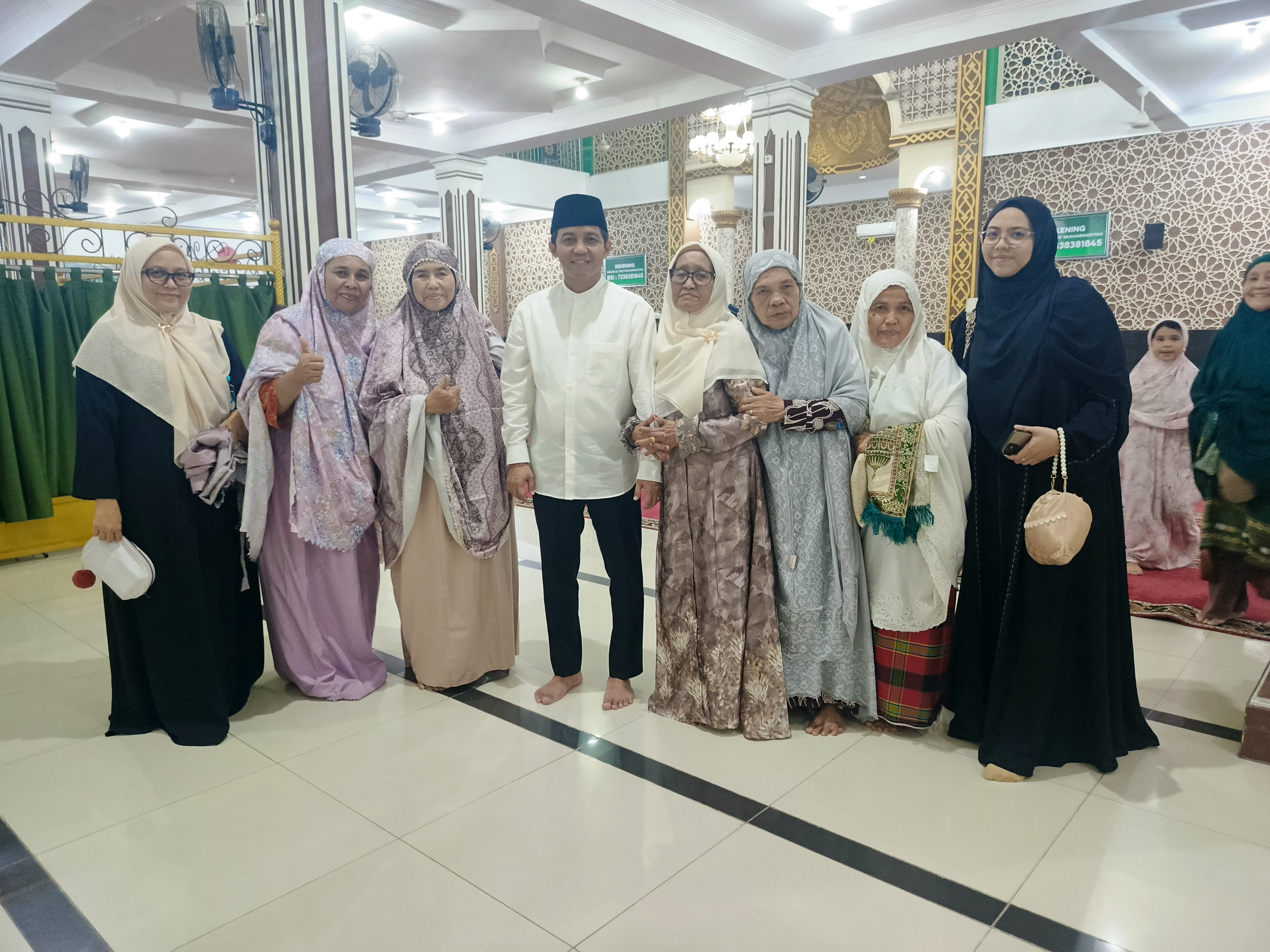 Ia melayani foto bersama, menyalami satu per satu jamaah, berbincang dengan teman-teman masa kecilnya. Tak ada sekat jabatan, yang ada hanya kehangatan.