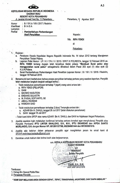 Berdasarkan laporan Rifayendi pada tahun 2015 Nomor NO.STPL/174/II/2015/SPKT III POLRESTA Pekanbaru selaku pelapor terkait pemalsuan surat tanah. Akhirnya Polresta Pekanbaru Telah Menangkap Tiga Pelaku Dugaan Pemalsuan surat Tanah Miliknya.