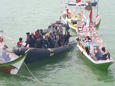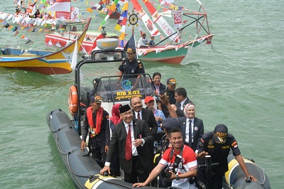 RanahRiau.com- Menteri Desa Pembangunan Daerah Tertinggal dan Transmigrasi Republik Indonesia (Mendesa PDTT RI) Eko Putro Sandjojo dan Kepala Badan Keamanan Laut Republik Indonesia (Kabakamla RI) Laksdya TNI Ari Soedewo, S.E., M.H., menginspeksi puluhan perahu hias di perairan perbatasan, Sebatik, Kabupaten Nunukan, Kalimantan Utara, dengan menggunakan perahu karet, Kamis (17/8/2017).