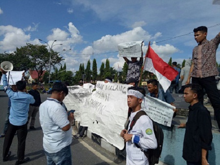 Puluhan mahasiswa yang tergabung dalam Himpunan Pelajar Mahasiswa Rokan Hilir (HIPEMAROHI) melakukan unjuk rasa di Tugu Zapin, Jalan Sudirman Pekanbaru, Rabu (11/10/2017).