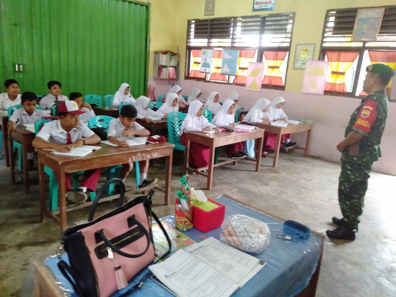 KUANTAN SINGINGI, RANAHRIAU.COM- Koramil 08/KM Dim 0302/INHU, a.n Serda INDRA GUNAWAN memberikan pembekalan Wawasan Kebangsaan (Wasbang) tentang Bhineka Tunggal Ika, dan Pancasila kepada siswa siswi SD Negeri 008 Kuantan Mudik, Kabupaten Kuantan Singingi, Riau. Senin (21/01/2019).