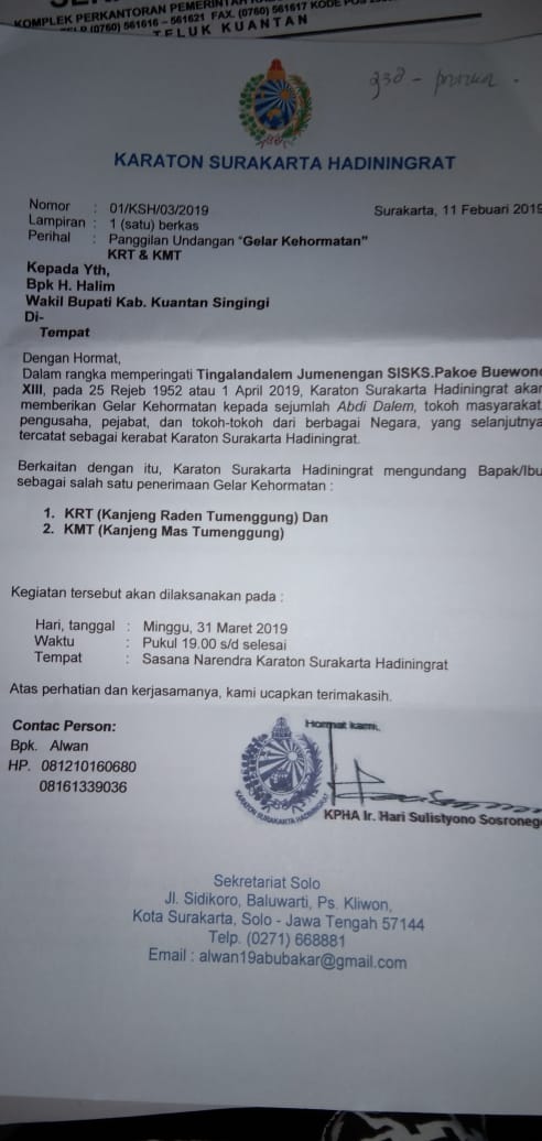 Terkait hal ini, Wakil Bupati Kuansing H. Halim saat dihubungi oleh wartawan Sabtu (02/03/2019) melalui pesan WhatsApp membenarkan bahwa dirinya menerima undangan dari Keraton Surakarta Hadiningrat, dengan perihal penerimaan gelar Kehormatan KRT dan KMT.